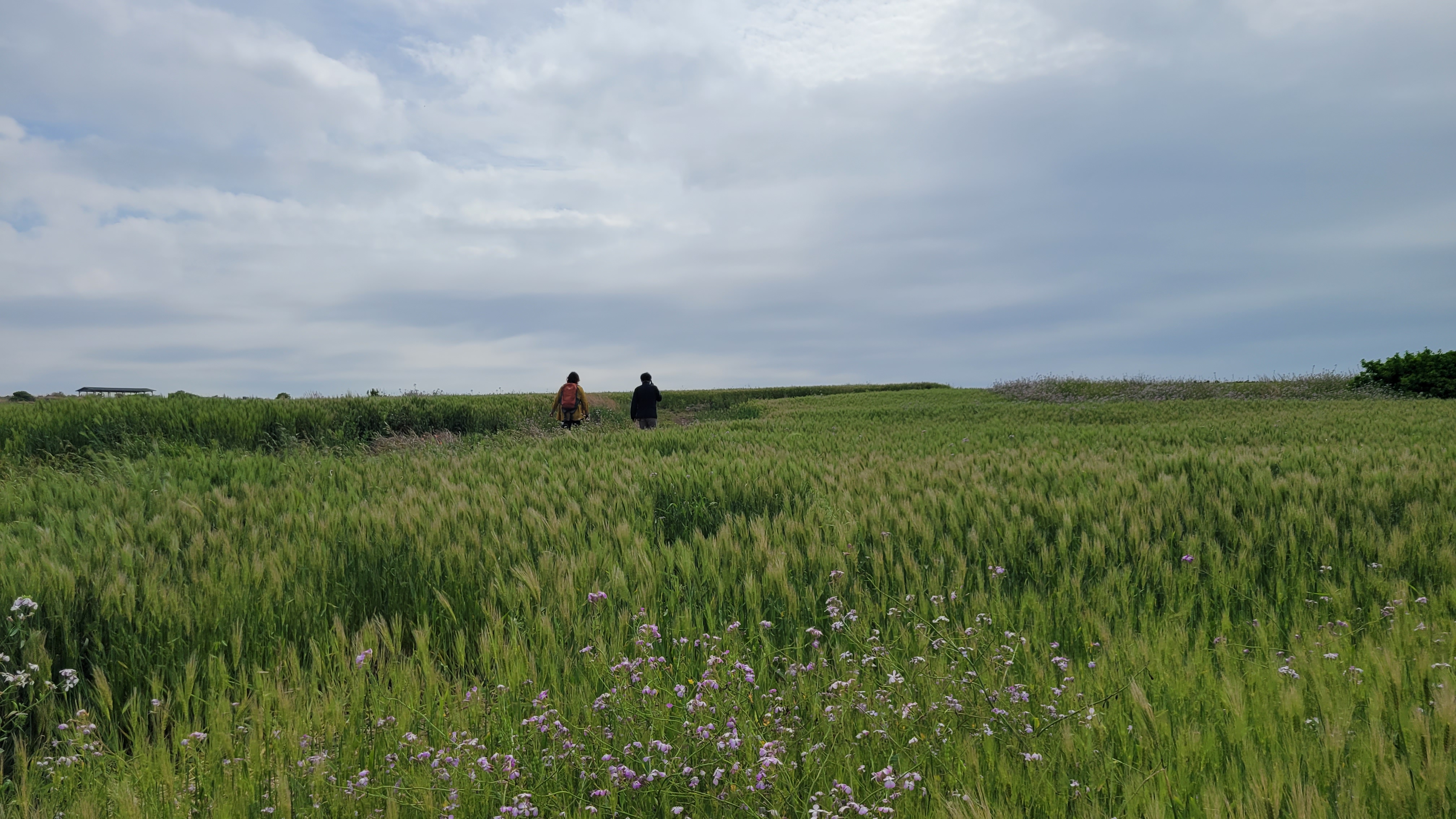 바다의 윤슬처럼 바람에 쓸려 반짝이는 보리 이삭, 그리고 그 사이를 걷는 중년의 부부, 앞서거니 뒤서거니 돌담길을 걷는 가족들, 황혼의 아름다움을 청보리밭과 함께 사진에 담으려는 동창생들, 자전거 한 대를 앞 뒤에서 열심히 페달을 밟는 연인들. 어느 순간, 우리 모두는 하나가 되어 웃고 떠들며 초록 물결 속으로 조용히 스며들었습니다.